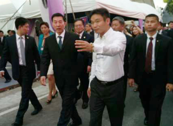 三一重工副總經(jīng)理、亞太大區(qū)總經(jīng)理謝鋒先生作為設(shè)備企業(yè)代表,向王勇國務(wù)委員及巴金副總理一行對此次參展的三一設(shè)備及三一在泰國的發(fā)展作了詳細介紹。在得知三一目前在泰國的設(shè)備保有量已接近3000臺,其中泰國新國家火車站有300臺三一設(shè)備參與建設(shè),起重機的市場占有率已超過60%時,王勇國務(wù)委員對三一在泰國所取得的成績表示祝賀,并對一同參觀的巴金副總理正式介紹了三一。兩國領(lǐng)導(dǎo)人紛紛在三一起重機前合影留念。